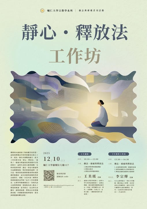 【工作坊】【 靜心・釋放法 工作坊 】 佛教與療癒系列活動以「佛法、療癒與釋放法」為主題,當天活動分為早上場的講座,以及下午的實作工作坊兩場次 日期:12/10(週三) 時間:10:10-12:00、13:30-16:30 地點:輔仁大學羅耀拉大樓117 室 More info 專題演講