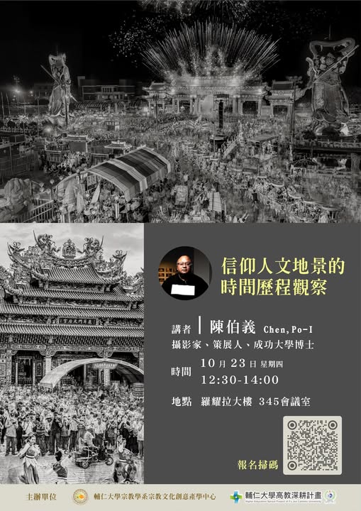 【演講】信仰人文地景的時間歷程觀察 講座時間:10/23(四)12:30-14:00 講座地點:羅耀拉大樓 345 會議室(SL345) 專題講者|陳伯義(Chen, Po-I) More info 專題演講