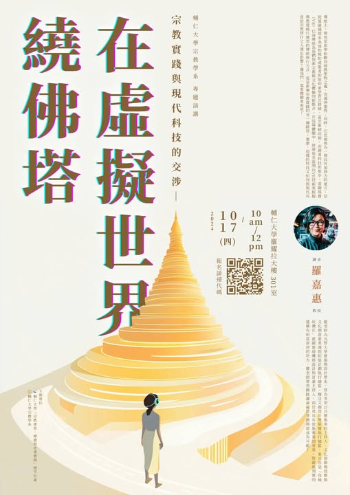 【演講】宗教實踐與現代科技的交涉─在虛擬世界繞佛塔 時間: 113年10月17日(星期四)10:10-12:00 地點: 輔仁大學羅耀拉大樓301室 主辦單位: .輔仁大學「宗教地景、療癒與社會實踐」標竿計畫 .輔仁大學宗教學系 More info