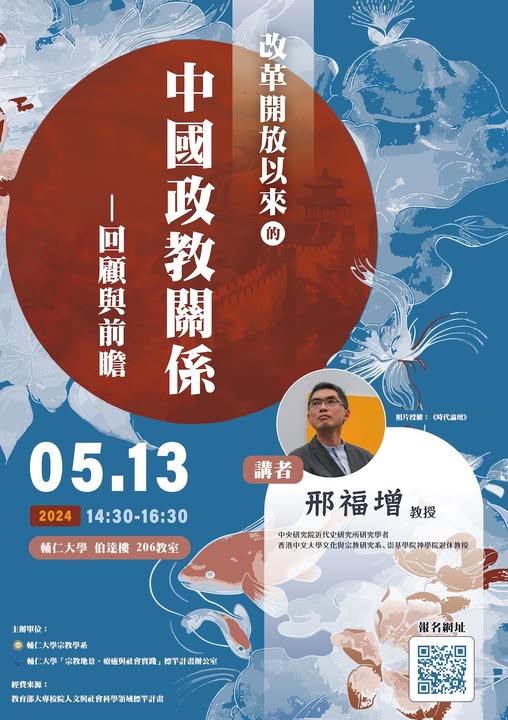 【工作坊】「歷史、生命、創傷的跨越與再生 」「電影中的薩滿與韓國巫堂文化工作坊 」 主講者:王廷宇 副教授(輔仁大學博物館研究所) 日期:113年05月09日(四)1230-1400 地點:輔仁大學濟時樓e classroom - A 主講者:鄭印君 副教授(輔仁大學宗教學系) 日期:113年05月16日(四)1230-1400 地點:輔仁大學羅耀拉大樓301會議室 主講者:鄭印君 副教授(輔仁大學宗教學系)、王廷宇 副教授(輔仁大學博物館研究所) 日期:113年05月22日(三)1230-1400 地點:輔仁大學羅耀拉大樓301會議室 主講者:李千熙 女士(韓國抱川市綠水庵神堂堂主)、金在榮 教授(韓國西江大學宗教學系) 日期:113年05月24日(五)1330-1650 地點:輔仁大學濟時樓九樓國際會議廳 More info 專題演講