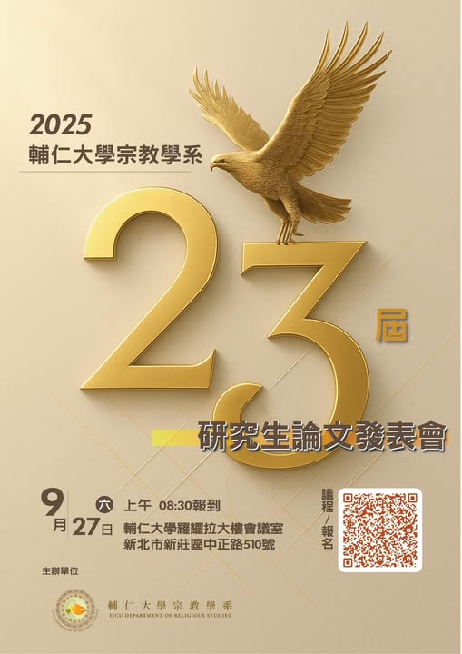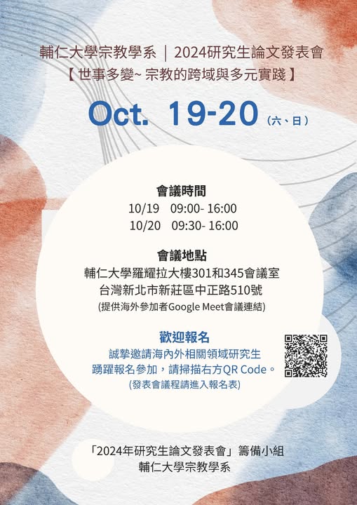 輔仁大學宗教學系「2024年研究生論文發表會」 會議時間:10/19 09:00- 16:00(六)、10/20 09:30- 16:00(⽇) 會議地點:輔仁⼤學羅耀拉⼤樓301和345會議室 More info 研究生小論文發表會